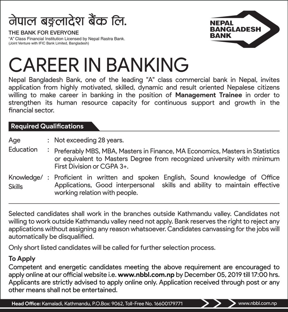 नेपाल बंगलादेश बैंकले व्यवस्थापन प्रशिक्षार्थी मागेको छ । यति नै संख्यामा भनेर बैंकले तोकेको छैन । उमेर हद २८ वर्ष तोकिएको छ । एप्लाई गर्ने म्याद डिसेम्बर ५ सम्म छ ।