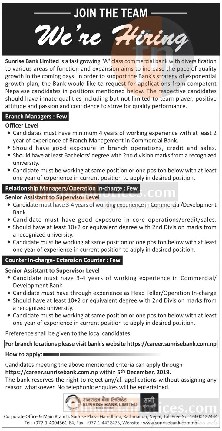 सनराइज बैंकले ब्रान्च मेनेजर, रिलेसनसिप मेनेजर वा अपरेसन इन्चार्ज र एक्स्टेन्सन काउन्टर इन्चार्ज मागेको छ । आवेदन दिने म्याद डिसेम्बर ५ सम्म छ ।